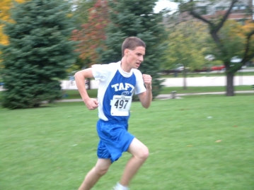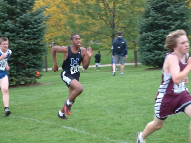 but some of these activities help us meet the requirements for merit badges.Two of our members are part of the cross country teams for their high schools. The picture below is of Alex S., who goes to Mather High School. Alex is running strong for the finish line, trying to improve his finish by one more place.